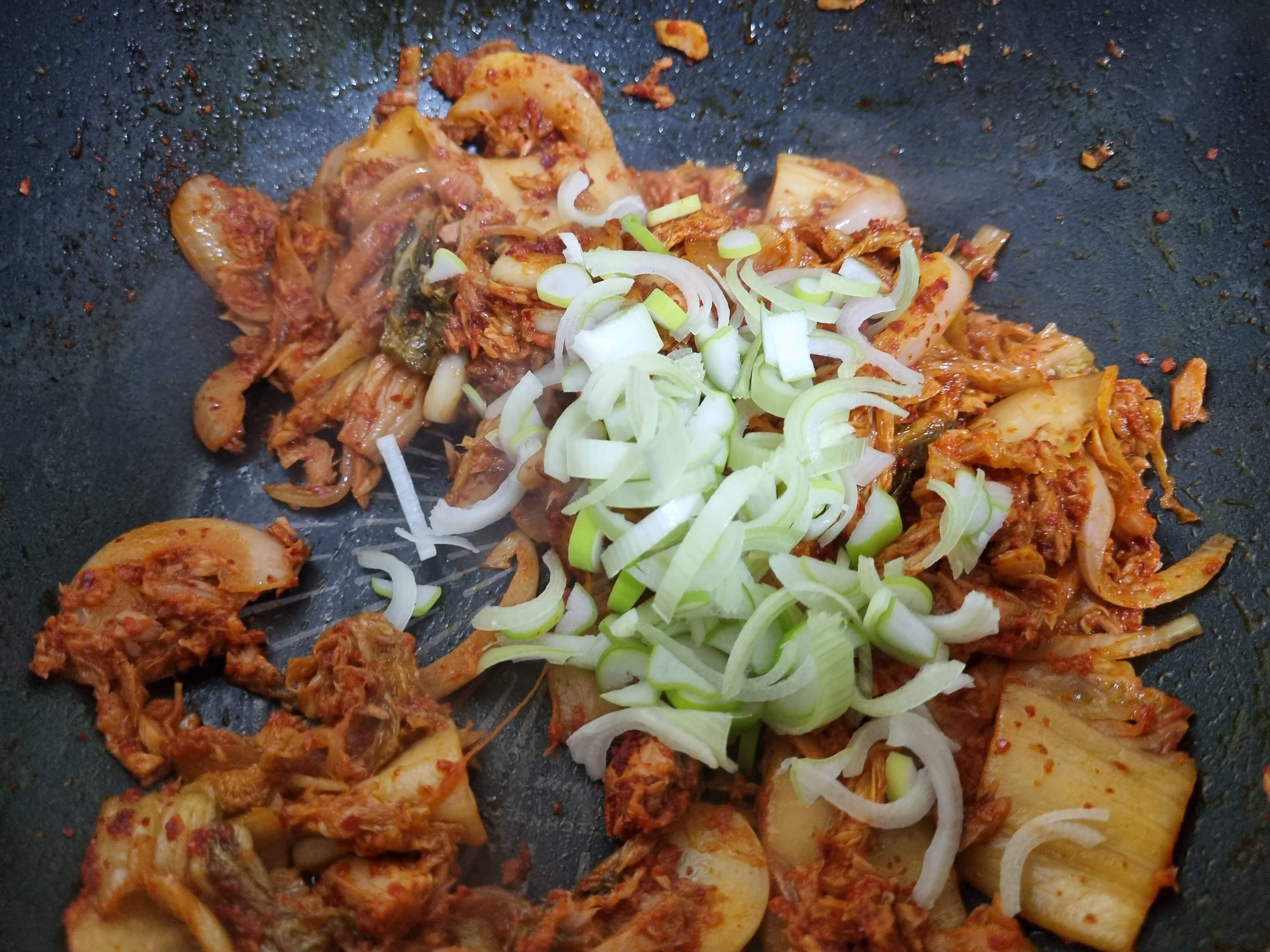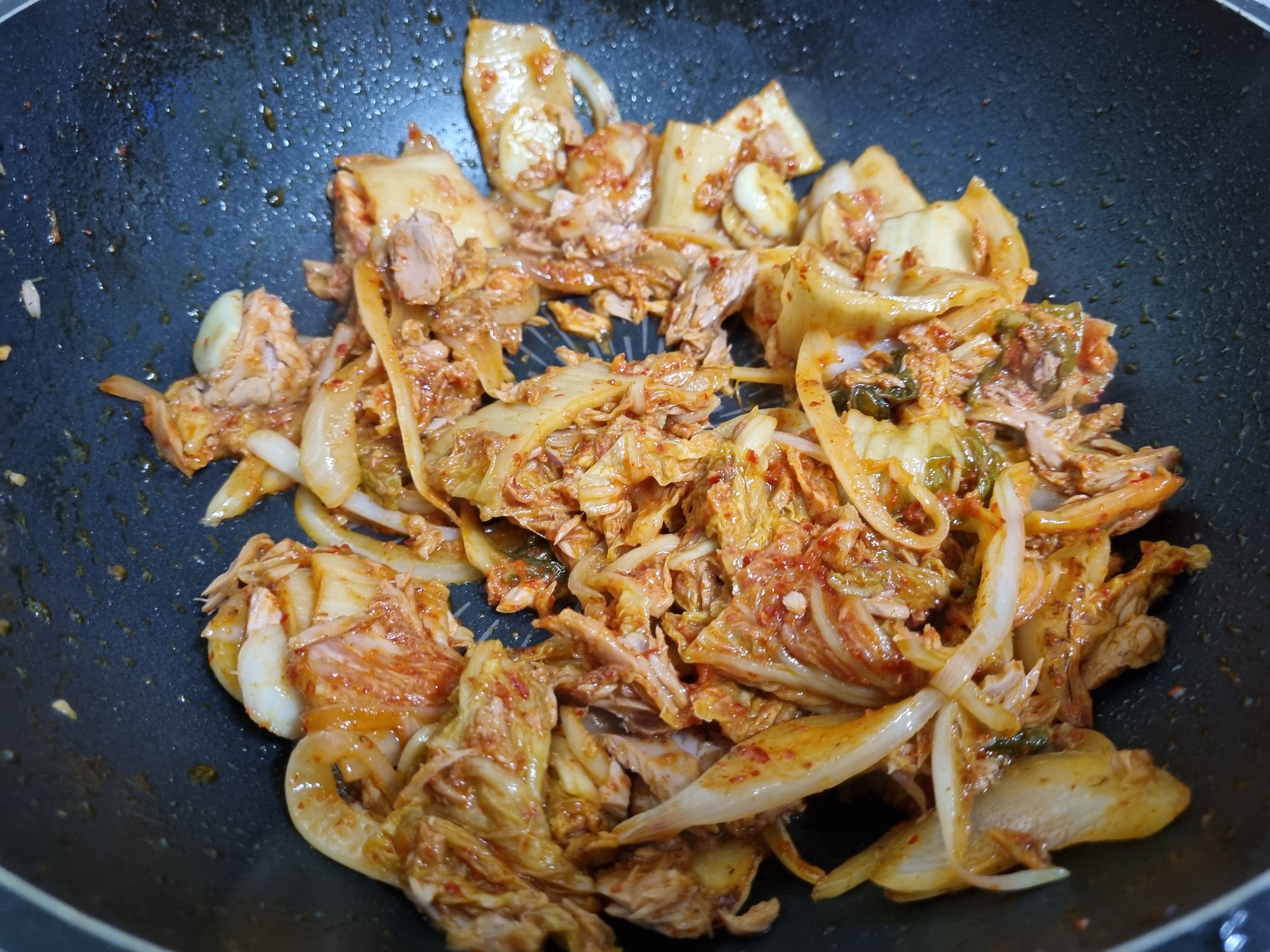 - 김치와 참치를 볶아준 다음 김치 국물을 4~5 숟갈 넣고 섞었습니다.