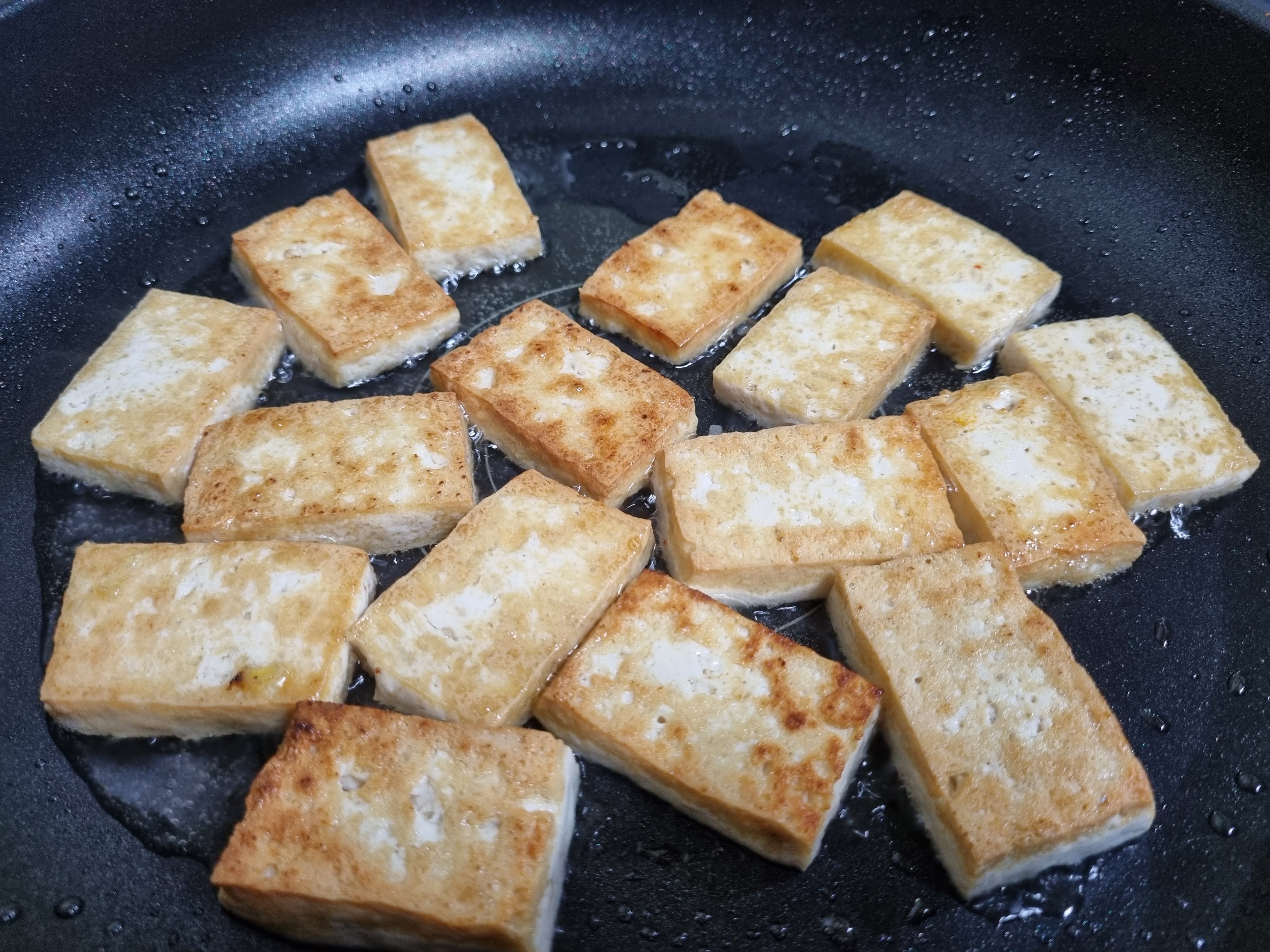- 중간에 두부도 한번 뒤집어준 다음 마지막에 보면 바짝 잘 구워져 있어요.
